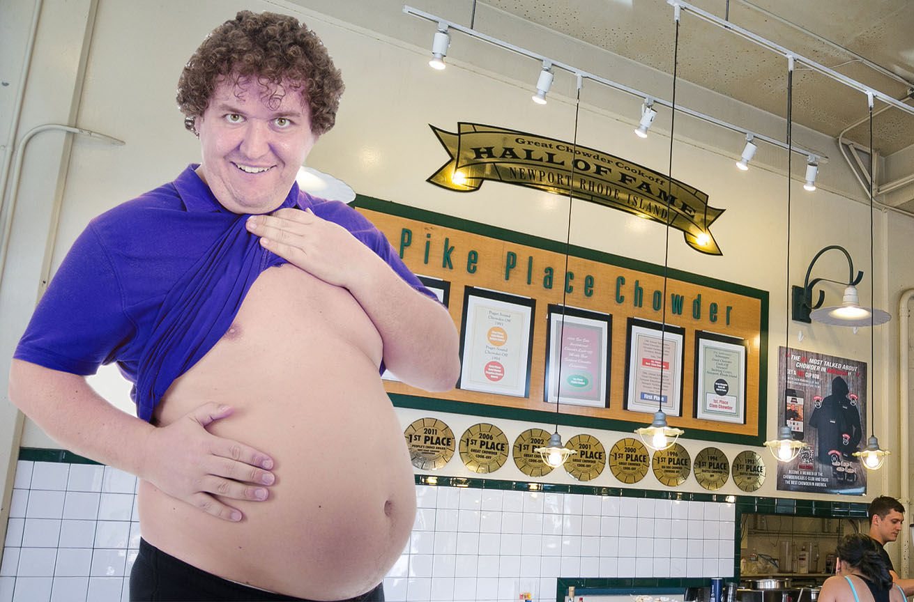 Dripping with the dew of Seattle’s late-fall mists came forth a man stout and round of shoulder, wide at midsection with two pale, girthy legs. Dressed in blue, the color of the sea and hue of the kingdom of clams, 43-year-old Rod Stanley’s gaping maw screeched to the heavens, beckoning a torrent of snow-white chowder. This magnificent specimen, this New England-style Adonis, is what we should all aspire to this chowder season.